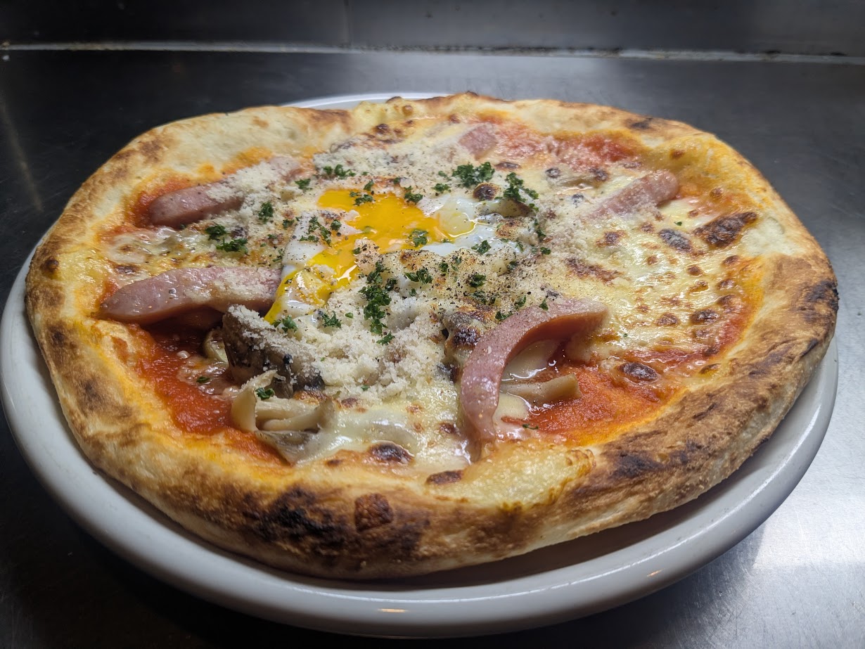 キノコとウィンナーのピッツァビスマルク(温玉のせ)