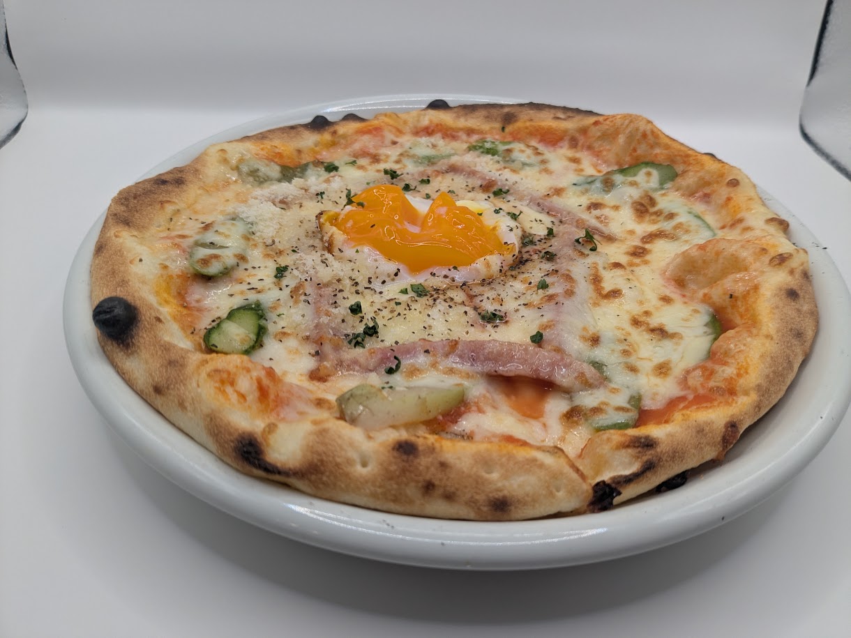 アスパラとウィンナーのピッツァビスマルク(温玉のせ)
